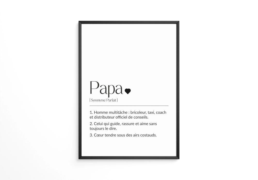 Vous êtes à la recherche d’un cadeau original et personnalisé pour surprendre vos proches ? L’affiche personnalisée Définition Papa est le choix parfait ! Que ce soit pour la fête des pères, la fête des mères, un anniversaire, ou tout simplement pour immortaliser un moment précieux, ce cadre personnalisé est à la fois élégant, amusant et original.
